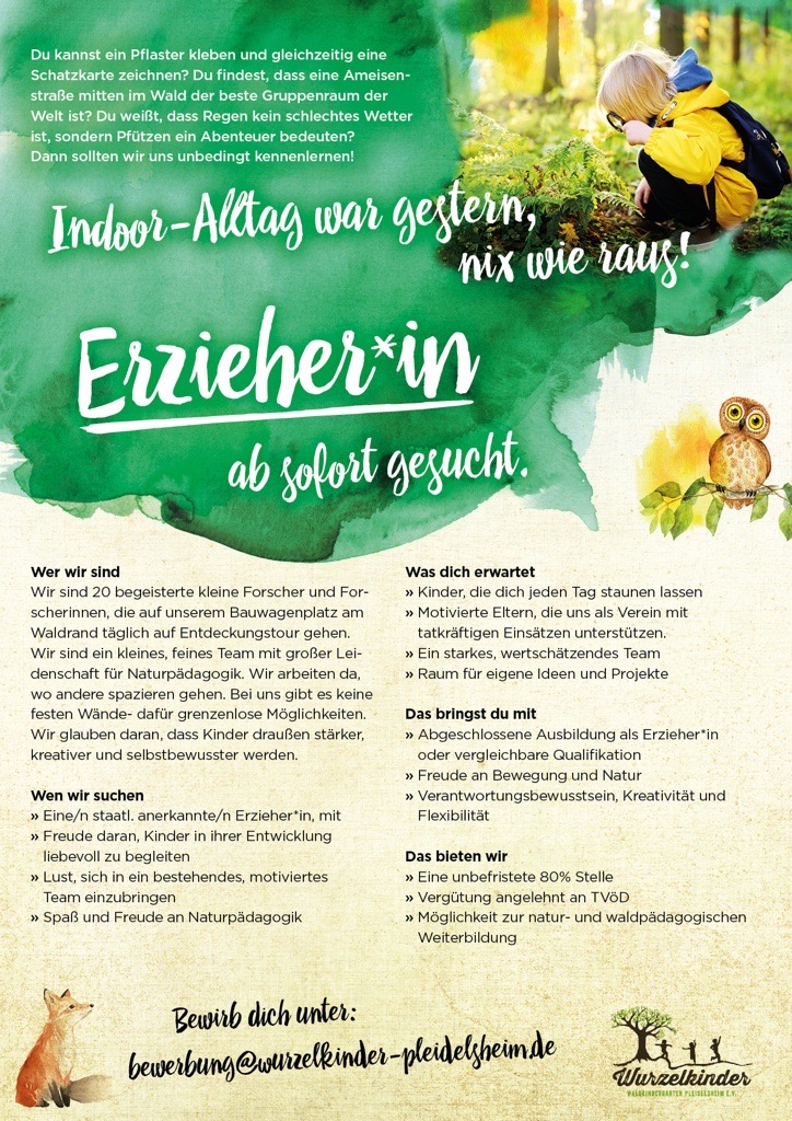 Der Wurzelkinder-Waldkindergarten Pleidelsheim e.V. ist eine eingruppige, staatlich anerkannte Kindertagesstätte mit verlängerten Öffnungszeiten. Als klassischer Waldkindergarten verwirklichen wir das pädagogische Konzept im täglichen Aufenthalt in der freien Natur, zu jeder Jahreszeit und bei fast jedem Wetter.
